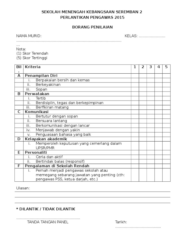 Format ini menyediakan satu. PERLANTIKAN PENGAWAS 2015 BORANG PENILAIAN NAMA MURID. Contoh borang penilaian prestasi.