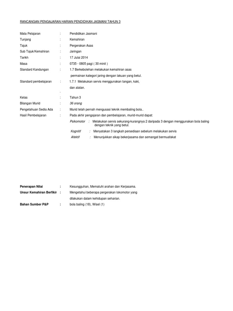 Rph Pendidikan Jasmani Pj Tahun 3 Kssr Rancangan Mengajar Harian
